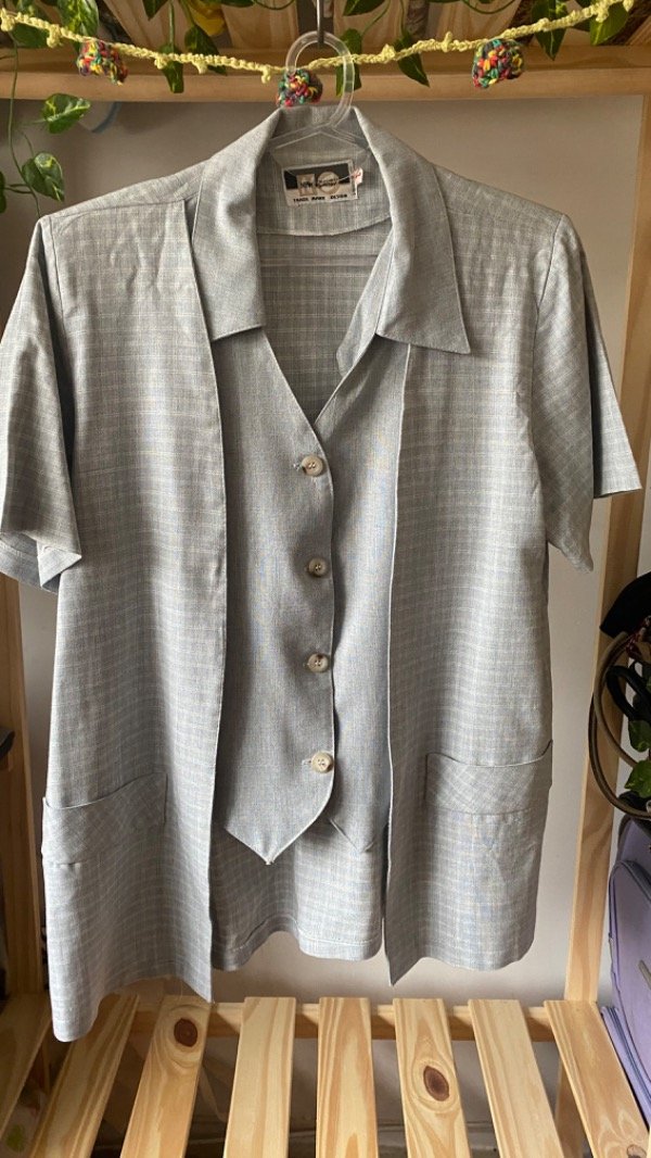 Set de dos piezas que incluye una chaqueta con chaleco de mangas cortas que tiene hombreras y el por otro lado el pantalón de tela super liviana con elástico en la cintura con bolsillos a los costados